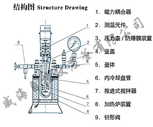 4、 釜蓋上裝有壓力表,爆破膜安全裝置,汽液相閥,溫度傳感器等,便于隨時(shí)了解高壓釜釜內(nèi)的反應(yīng)情況,調(diào)節(jié)釜內(nèi)的介質(zhì)比例,并確保安全運(yùn)行。